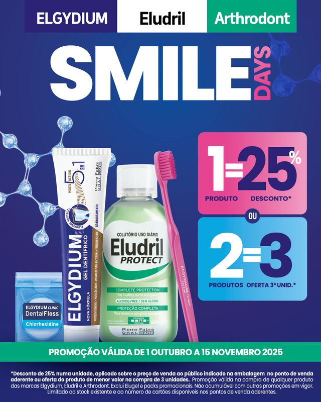 Até 15 de novembro, não perca o desconto de 25% na compra de um produto das marcas ELGYDIUM, ELUDRIL e ARTHRODONT ou, na compra de dois, oferta do terceiro (de menor valor)!