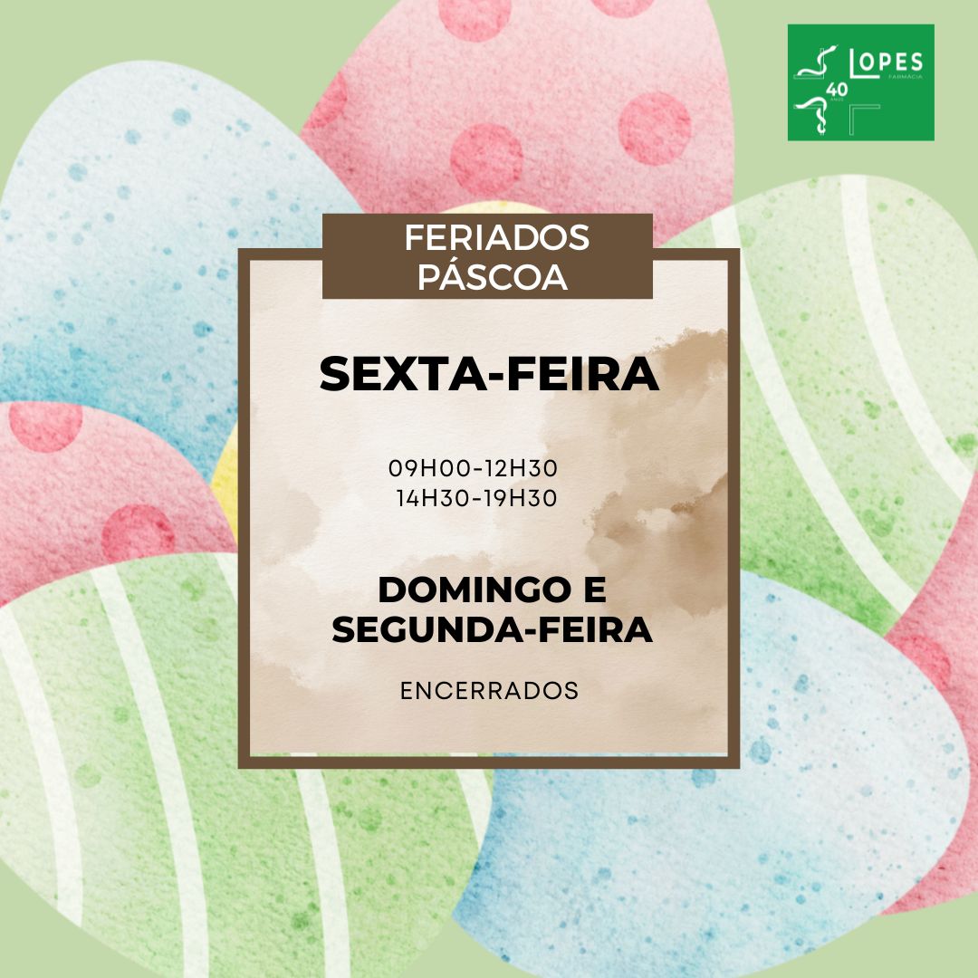 Na sexta-feira, dia 3 de abril, estaremos abertos das 09H00 às 12H30 e das 14H30 às 19H30. Informamos ainda que estaremos encerrados nos dias 5 e 6 de abril, correspondentes a domingo e segunda-feira.